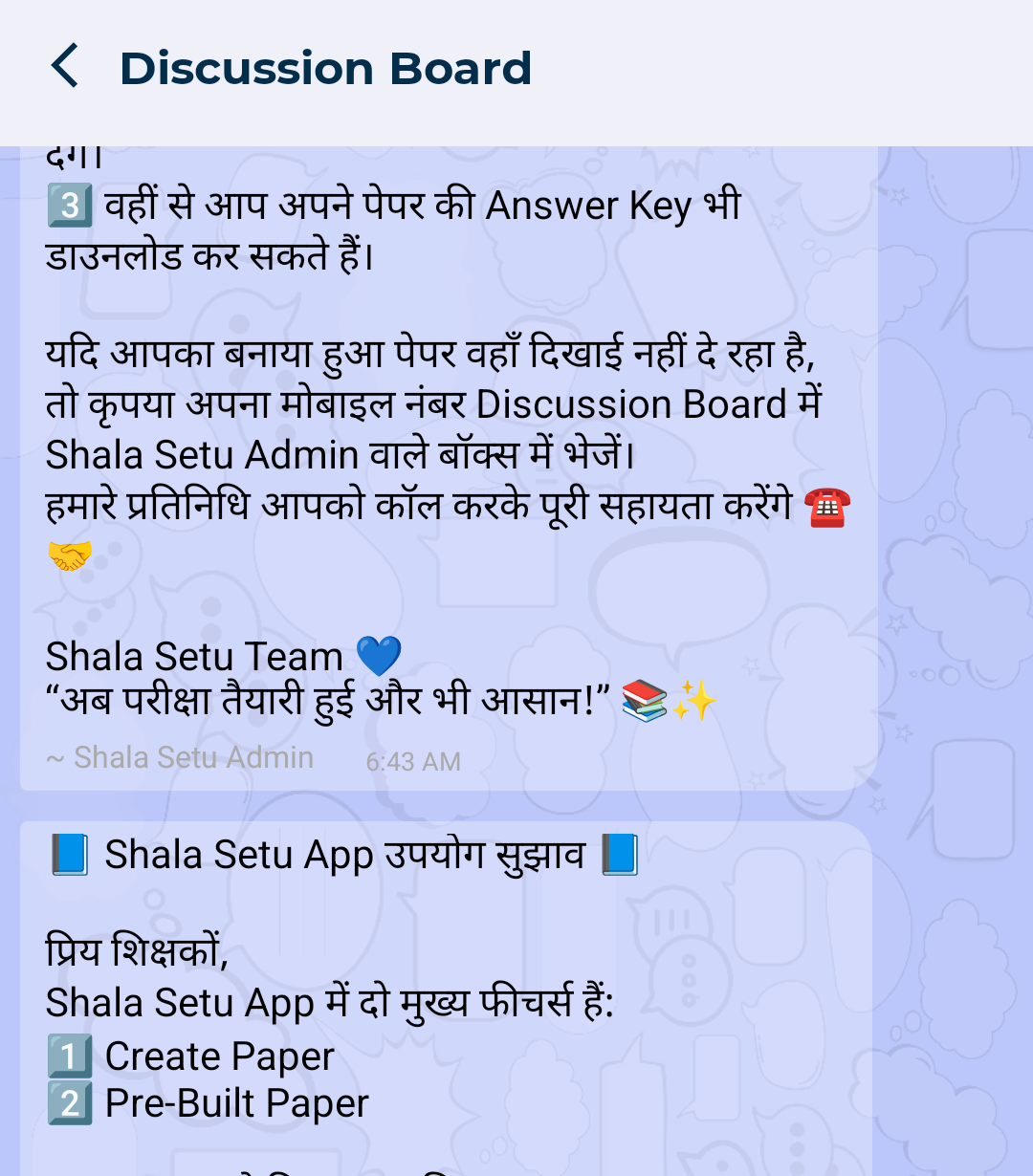 Join a community of 10,000+ teachers and schools on one platform! The Shala Setu Discussion Board lets educators share ideas, updates, and the latest information about exam paper creation and school activities. Stay connected, get instant support, and even send private messages to the Shala Setu Admin for personal queries, feedback, or technical assistance - all within the app.